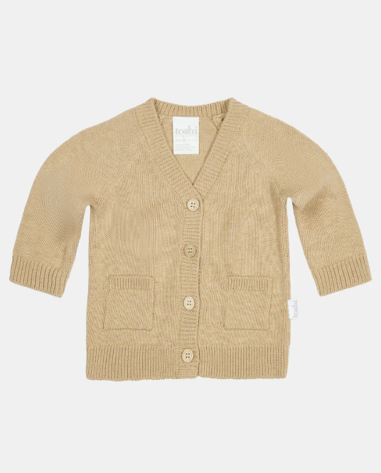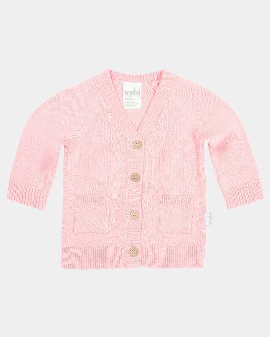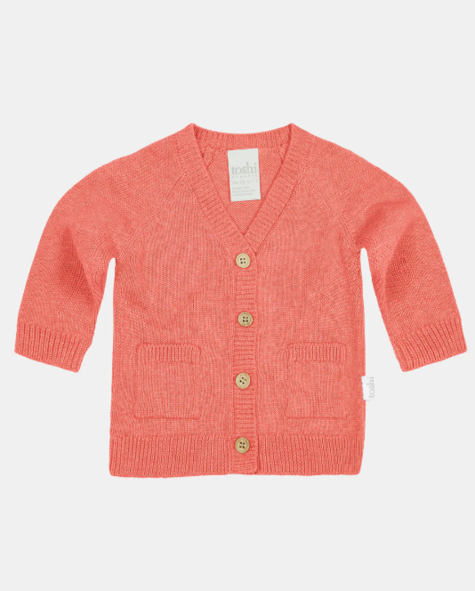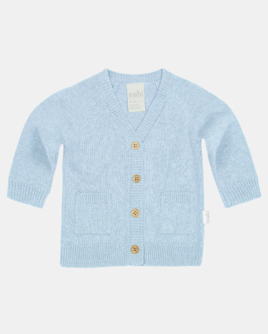The sumptuously soft Toshi Organic Baby Cardigan Remy is crafted from the finest quality certified 100% organic cotton yarn. Organic certification ensures the cardigan is gentle on your delicate baby, as well as our precious environment. A melange yarn offers a level of refinement to this cosy and nurturing Toshi baby accessory. The styling is relaxed and loose fitting and creates a classic and yet contemporary feel. Traditional wooden buttons and functional pockets are featured. Cardigan Remy is designed to keep precious babies warm and cosy during our cooler months