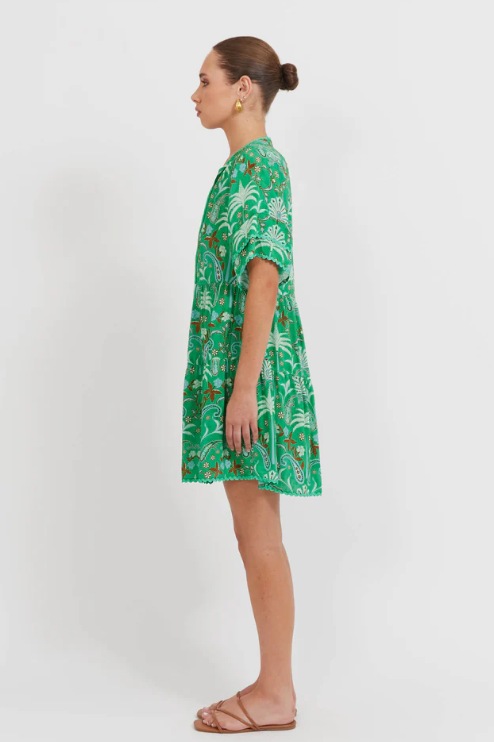 Slip into the Haiti Dress and instantly feel sun-kissed. This breezy beauty features a soft V-neckline with cotton ties, ric-rac trim, and a relaxed tiered silhouette. The short double-layer sleeves and airy linen blend add to its effortless charm, while internal side pockets keep it practical for days on the move.