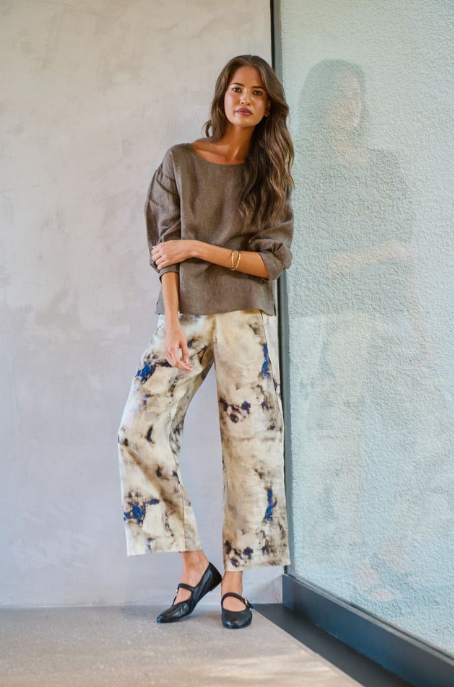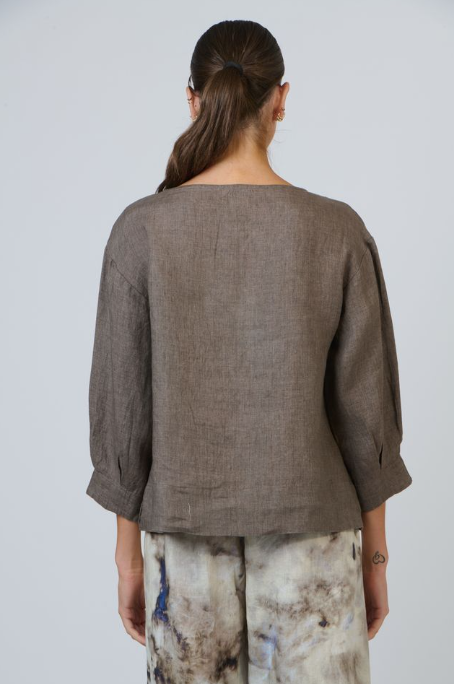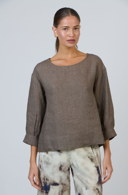 With its scooped neckline loose three-quarter sleeves and effortlessly oversized silhouette, it moves with a quiet unhurried grace. The 100% Linen fabric brings gentle texture and breeze light comfort, while the curved hem and dropped shoulders give it a laid back, modern charm.