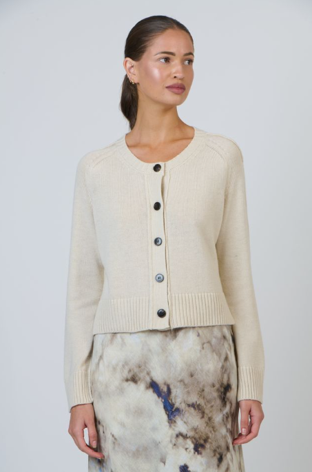 Featuring a classic crew neckline, long raglan sleeves, and a full button front. This knit offers gentle structure enhanced by wide ribbed cuffs and a wide ribbed hem that defines the waist. Designed with a semi fitted silhouette that moves comfortably with the body.