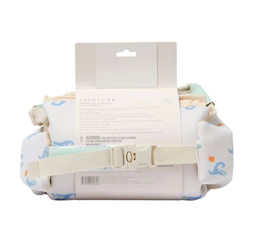 - Back double-action safety buckle clip to ensure children are secure in floatie jacket and cannot remove without an adult.