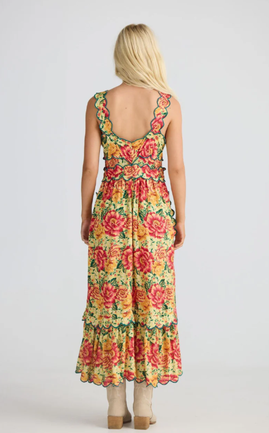Scallop edge details along straps, bodice, waistband, pockets, and hem