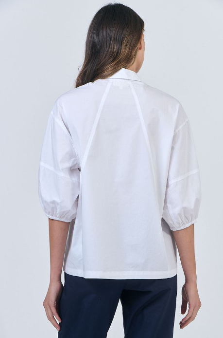 Its relaxed silhouette features a classic collar, buttoned front and elegant gathered three quarter length sleeves and a slightly cropped hem.