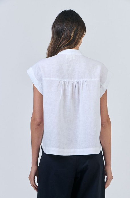 Designed with a modern relaxed fit, it features a unique band collar and cap sleeves, for a cool breezy feel. The back is styled with subtle pleated details, while the button-down front makes it easy to dress up or down.
