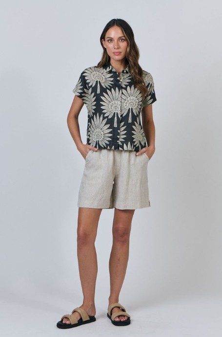With a button-down front collard neckline and short sleeves. It features two chest pockets and a slightly longer back with a central pleat for added flow.